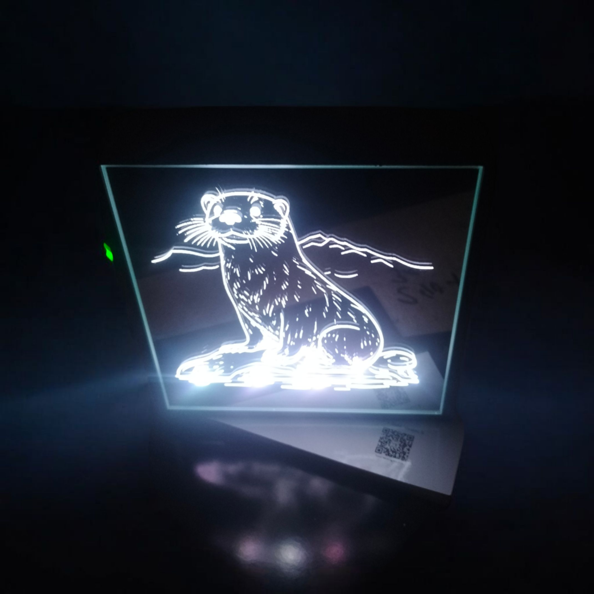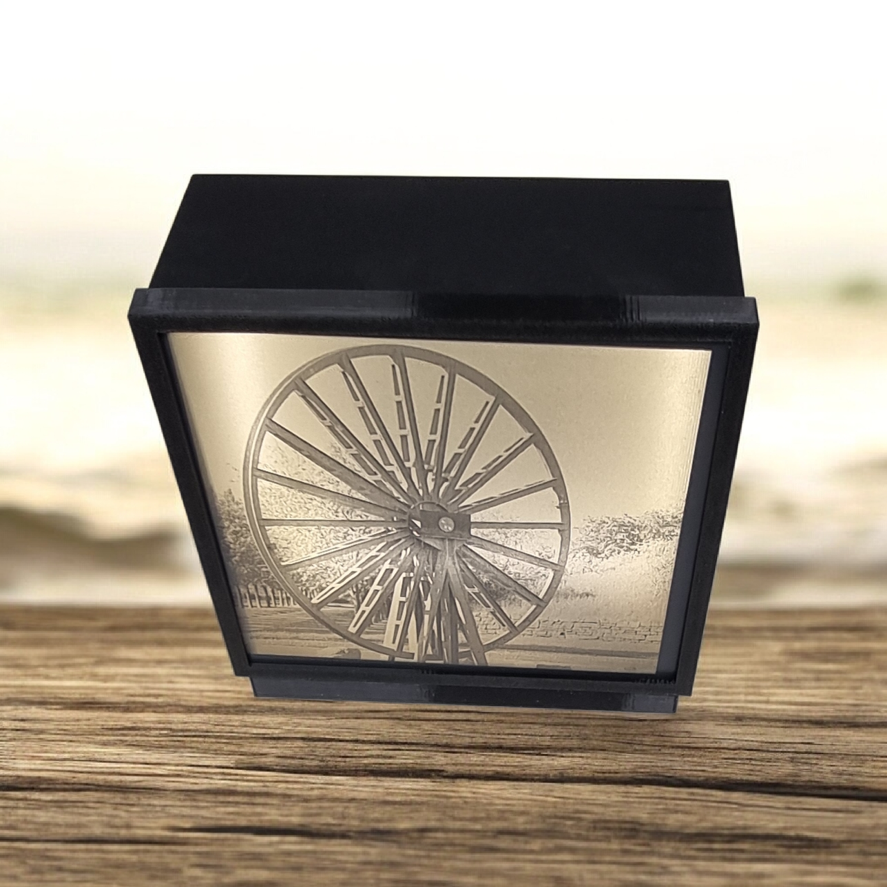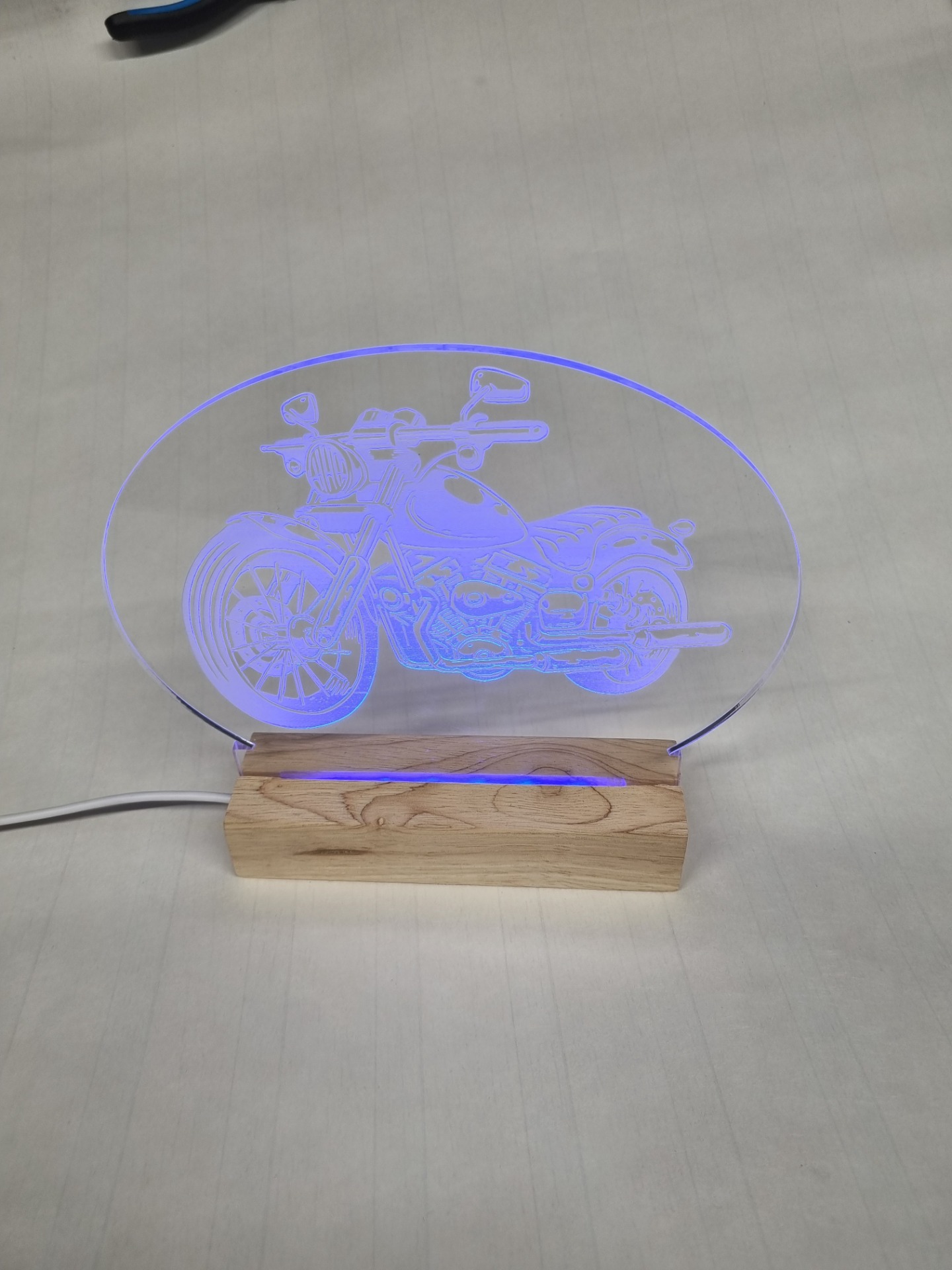 Beispiele für Lasergravuren auf Acrylglas mit Holzsockel und LED beleuchtet Dimmbar