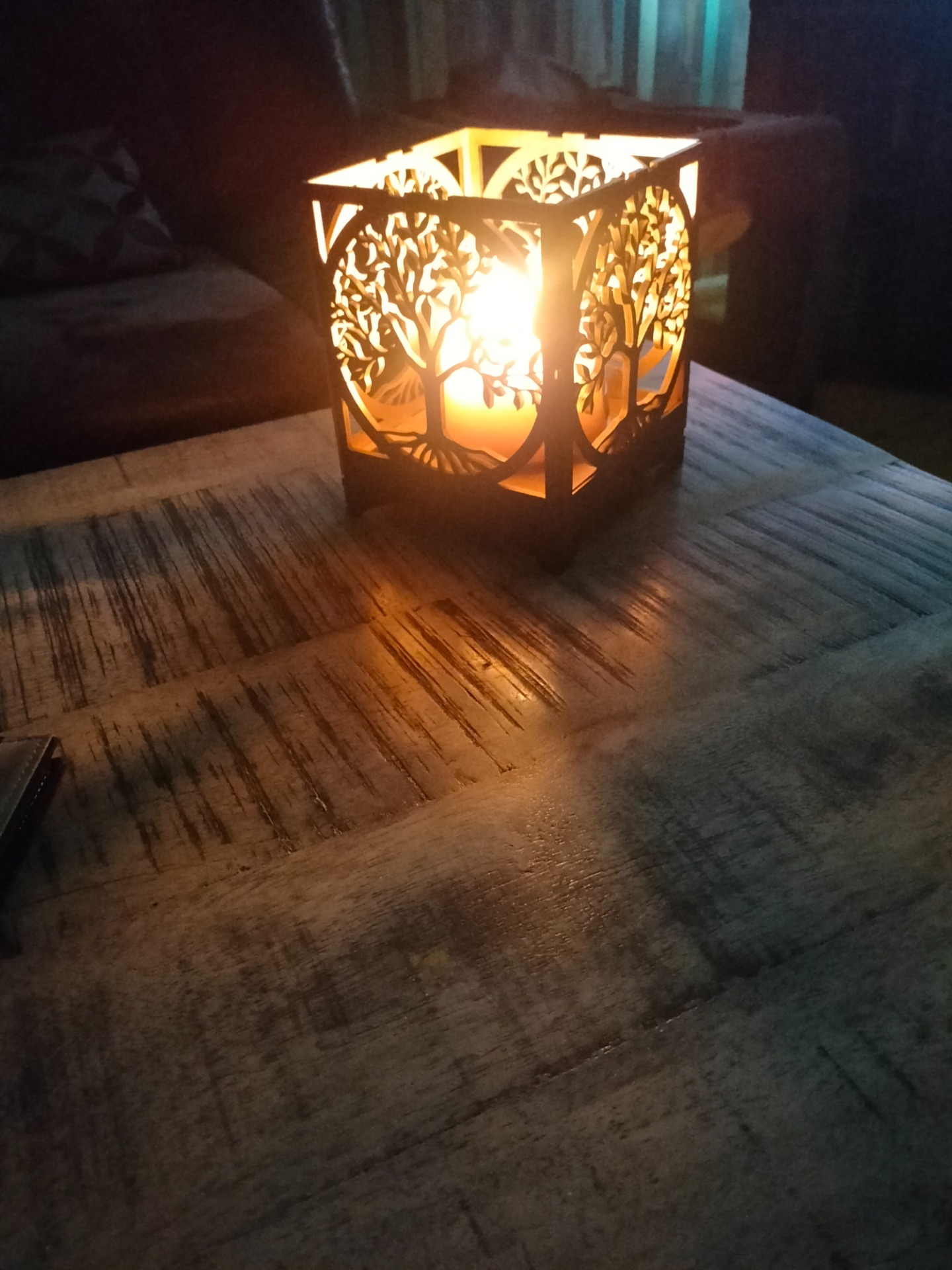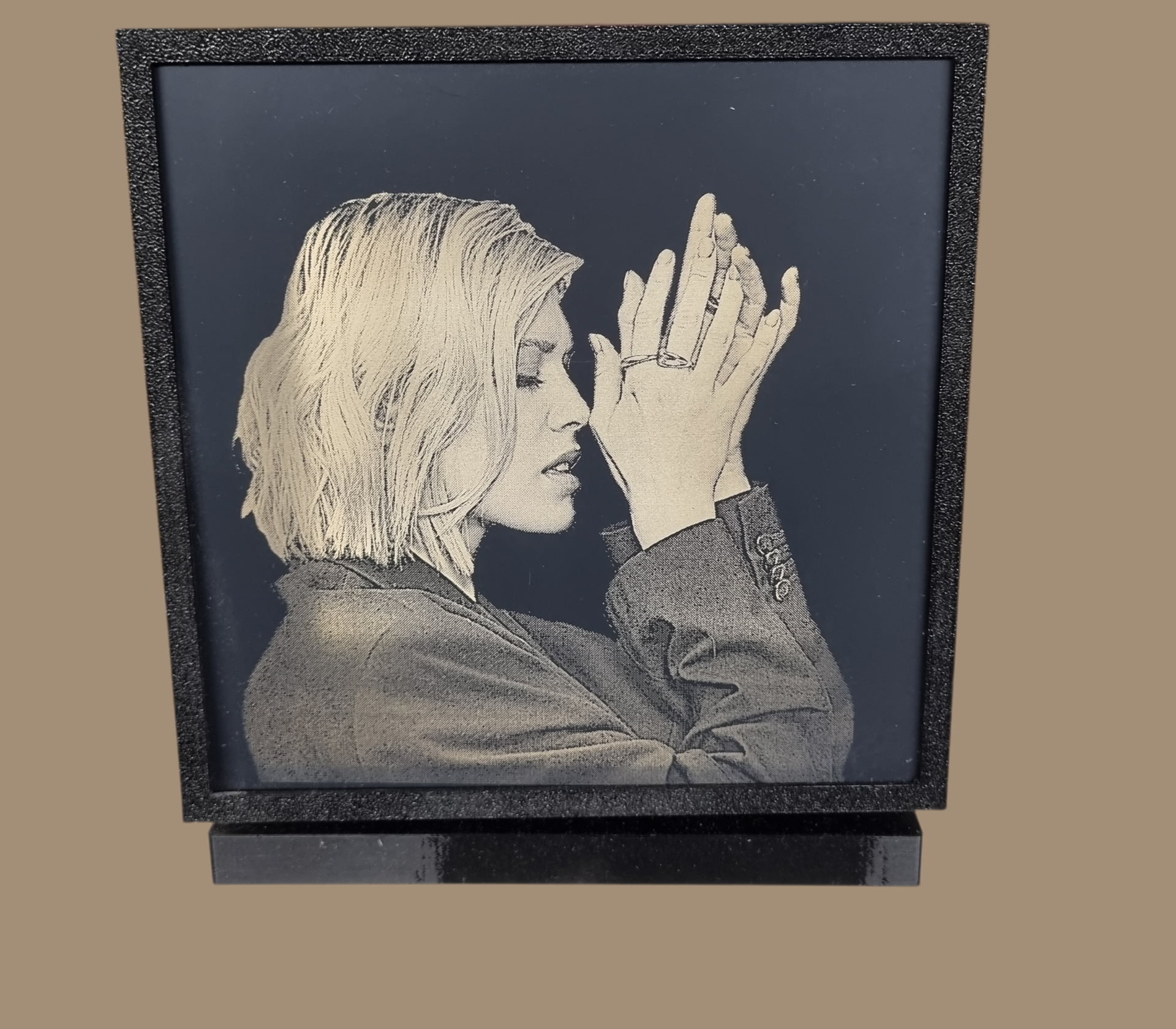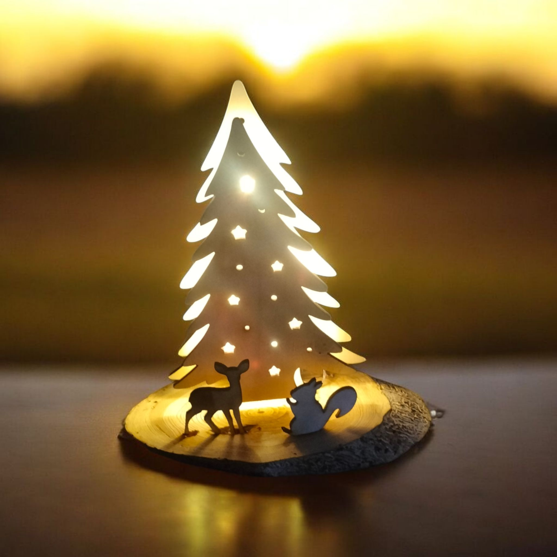 Beispiele für Lasergravuren auf Acrylglas mit Holzsockel und LED beleuchtet Dimmbar